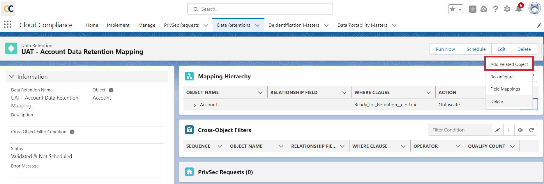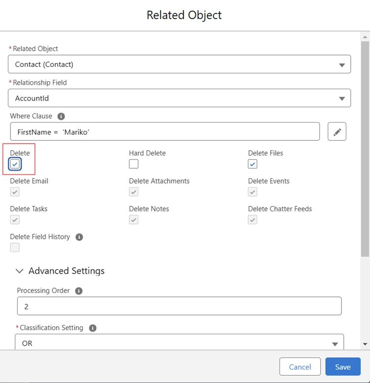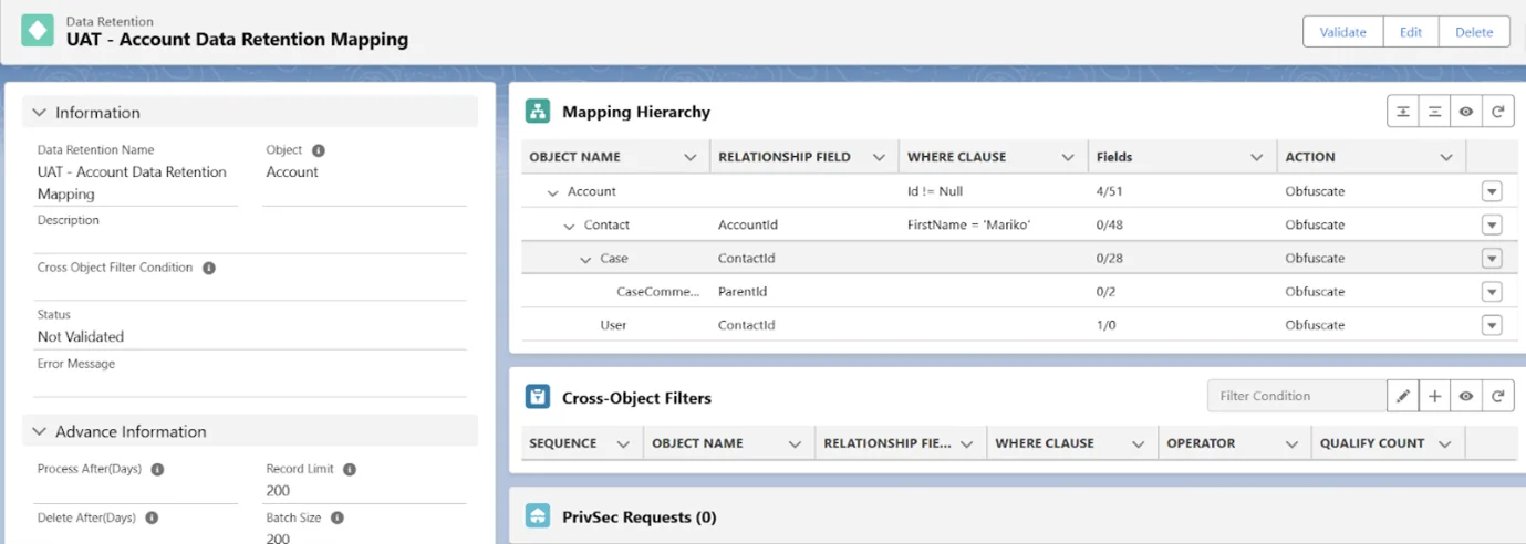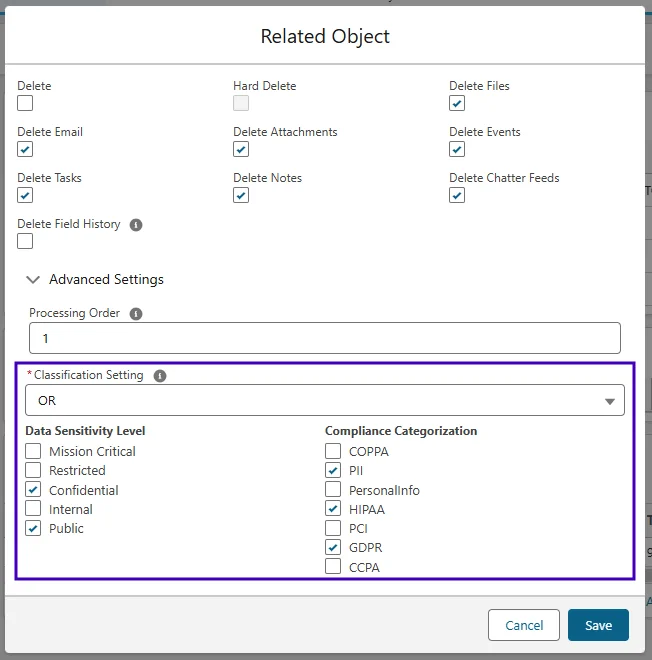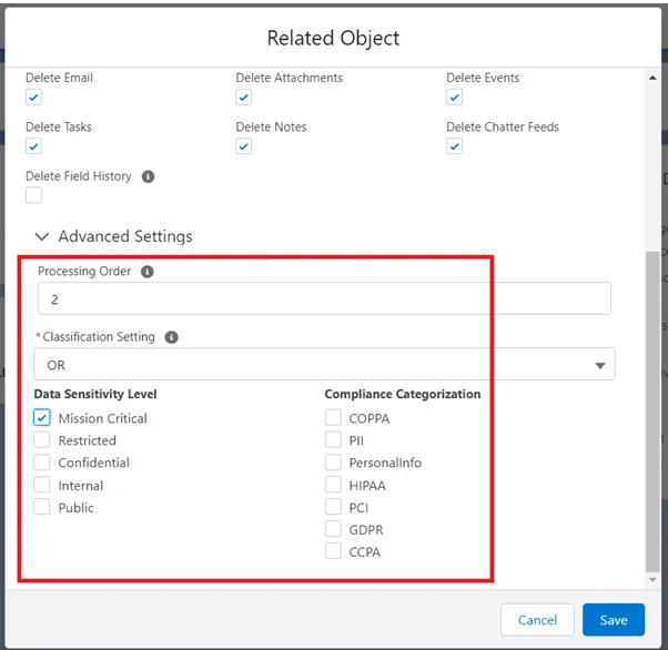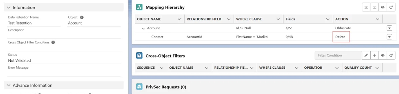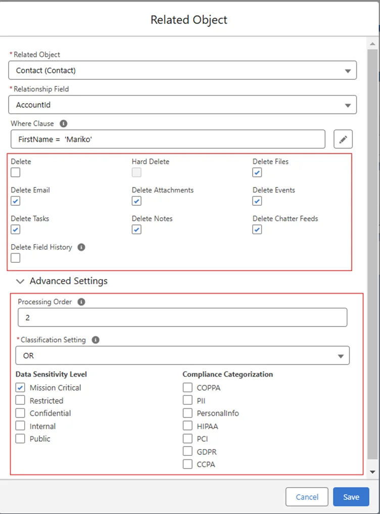 Processing Order: This functionality simplifies the processing of parent and related objects by allowing you to decide your own sequence within RTBF / Retention Mapping.