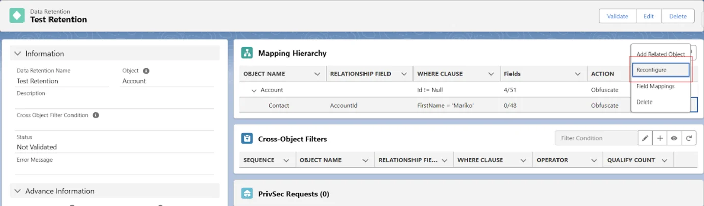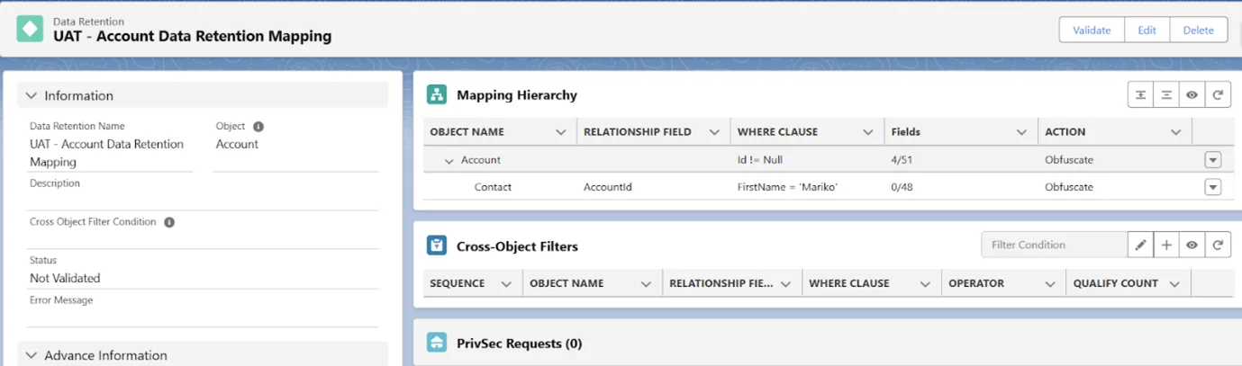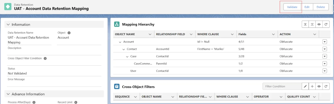 This will redirect you to the detail page of specific Data Retention mapping, where you will find the ‘Validate’ button.
