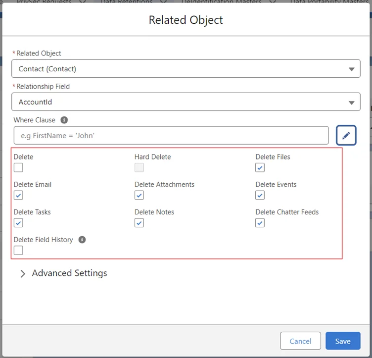 Where Clause – The “Where Clause” field allows you to filter records for De-identification dynamically and on the basis of cross-object values.