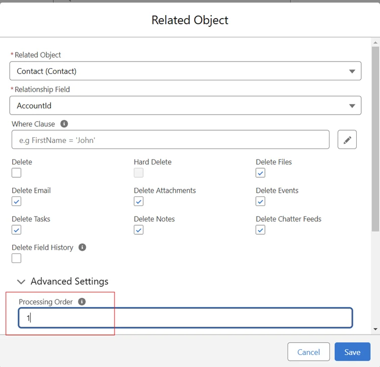- For Example, If the Account is a parent and the Case is a child of the Account, the processing order for the case is 1, and the processing order for the account is 2.