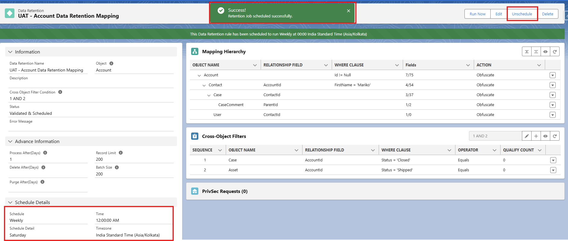 - Users can click on the ‘Unschedule’ button. This action will unschedule the retention mapping and wipe out details under the ‘Schedule Details’ section.
