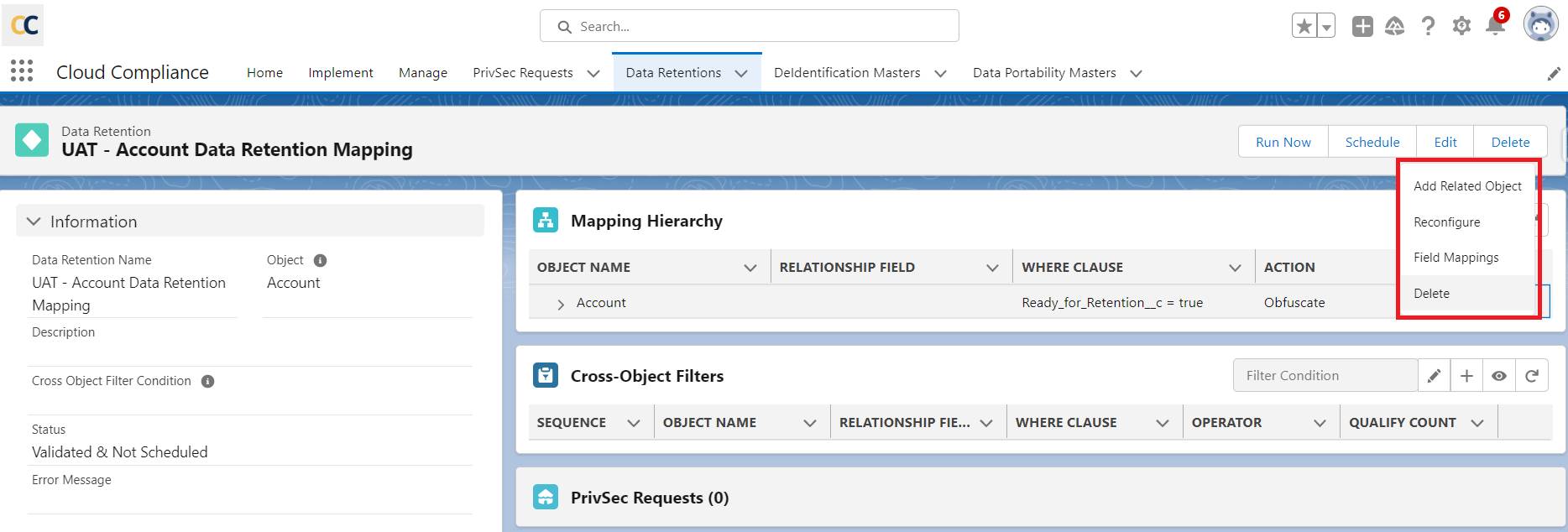 Record Limit – The “Record Limit” field divides the PrivSec Request record depending upon the Record Limit mentioned. For example, if the Record Limit is set at 20 and if we follow the Retention Rule, there are 100 qualified Contacts, then 5 PrivSec Request records will be created to avoid Record Locking issues.