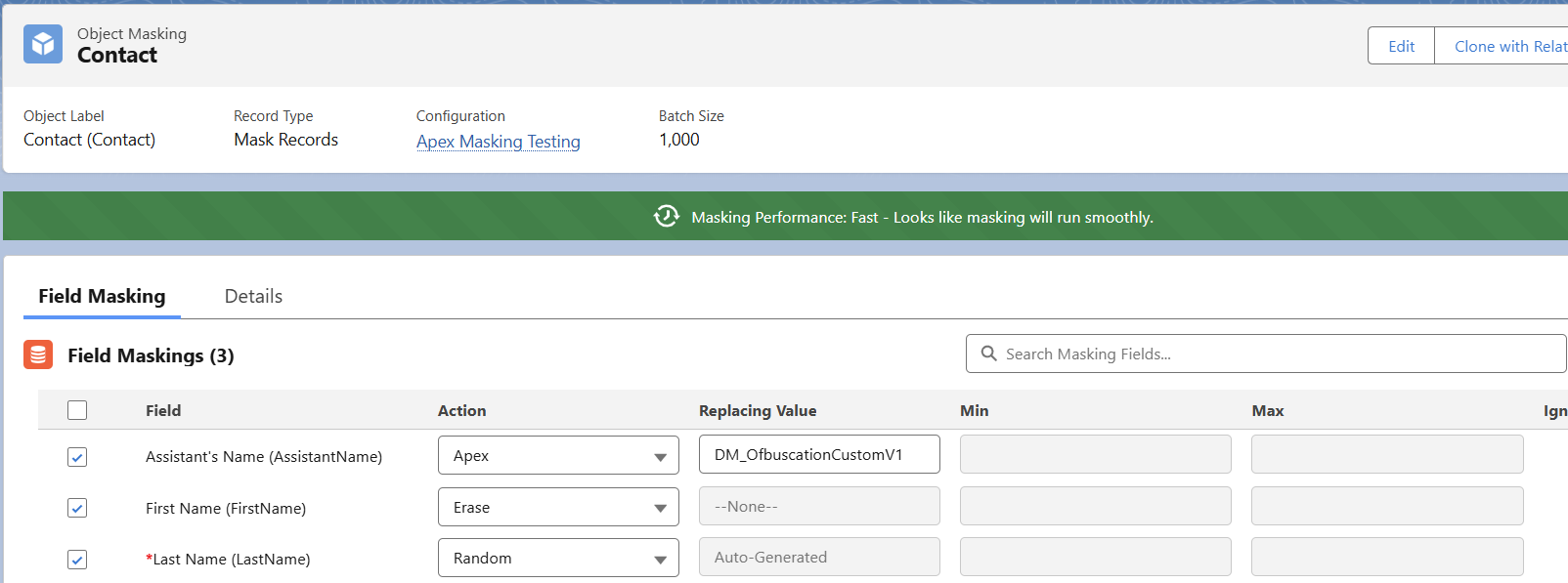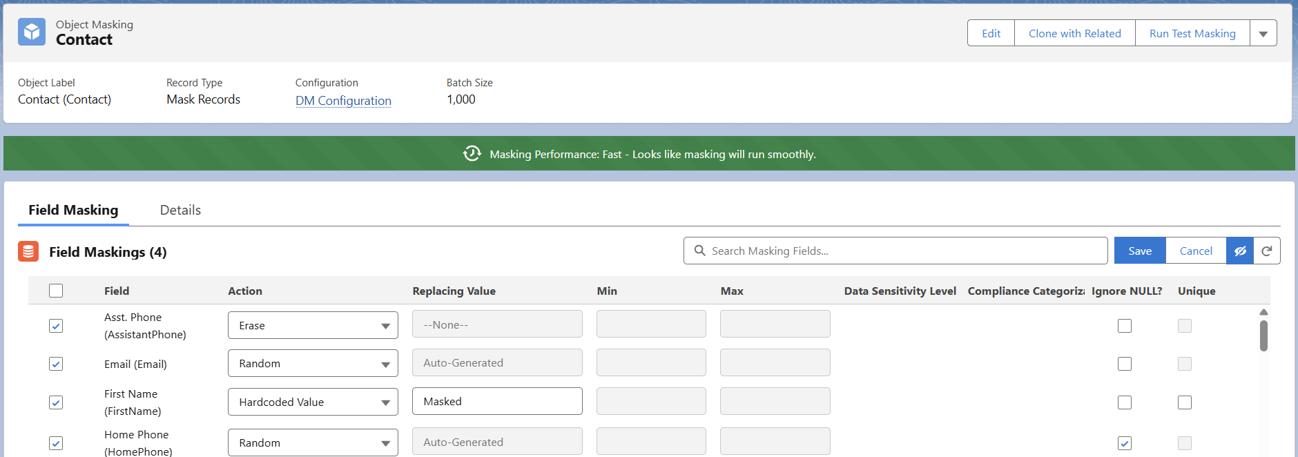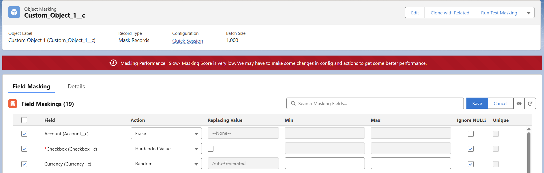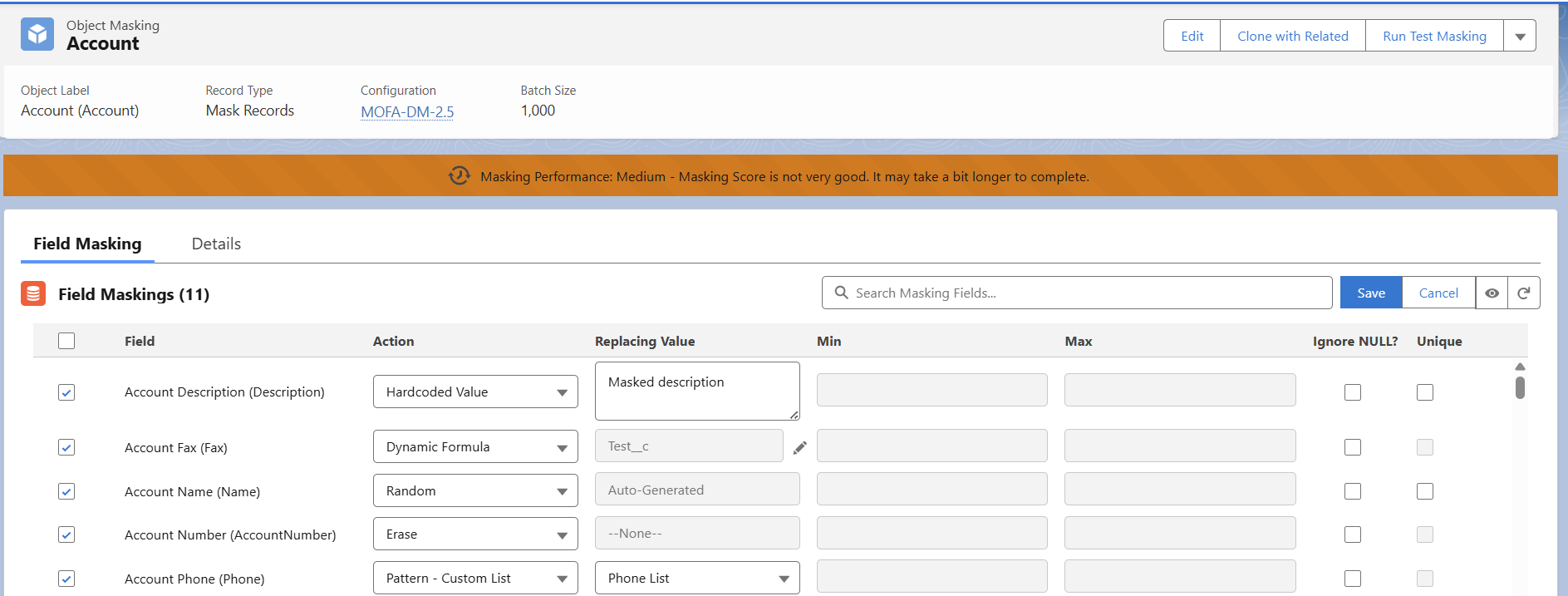 - Yellow banner: (Masking Performance: Medium—Masking Score is not very good. It may take a bit longer to complete). In the below configuration, Random and custom list actions are included in field masking actions. Random is considered to be an expensive operation compared to Erase and hardcode.