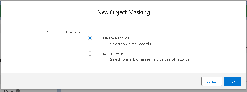 You will then be prompted to select a record type: ‘Delete Records’ or ‘Mask Records’