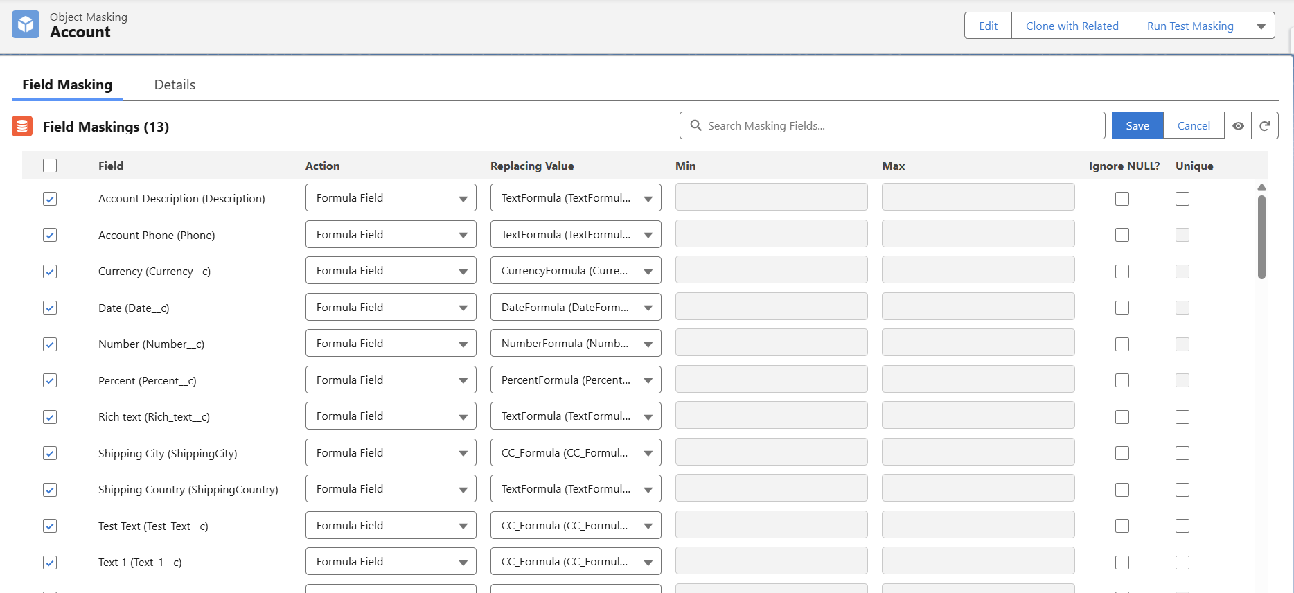 Here, the configuration has Custom and regex patterns and formula fields as masking actions, which makes it complex.