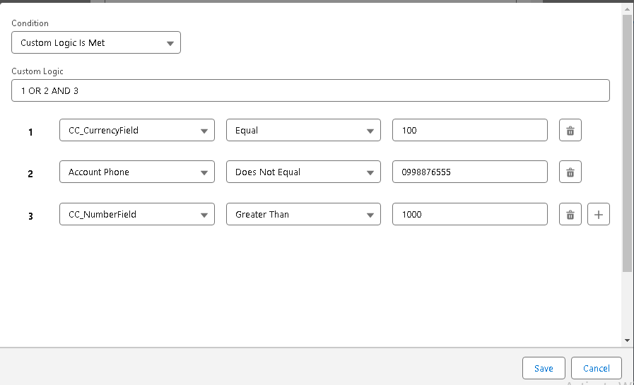 You can use the Filter Criteria to filter records based on your own criteria. Everything that can fit into the SOQL WHERE clause can also fit into the Filter Criteria. Logical operators, Literals, LIMIT, and others can be utilized. Click on the pencil icon to create filter criteria using the query builder. Which includes ‘All/Any Conditions met’ and custom logic made by the user. Filter criteria created by using these operators have a very low probability of syntax errors.