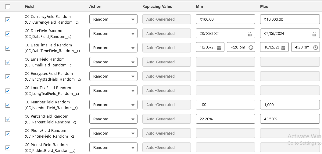 The user can search any field with its data type or API Name and field name. This helps users find field selections for masking for any object.