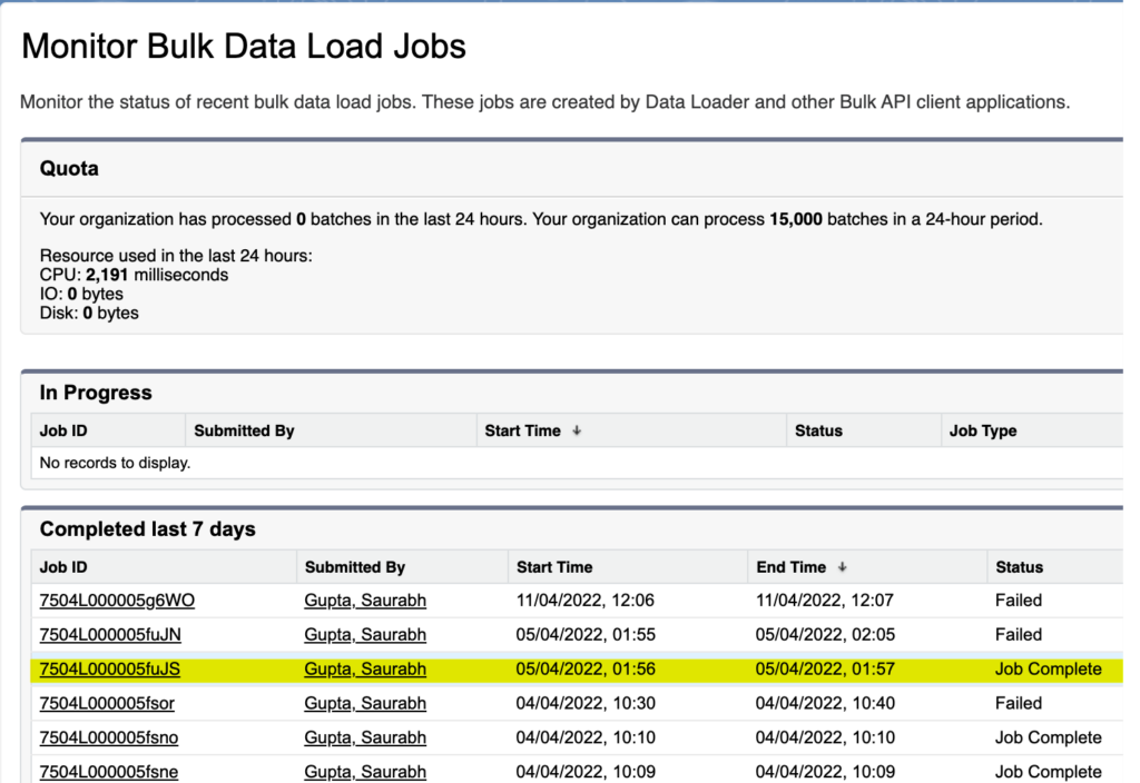 Step 3: Once a job is submitted, go to ‘Navigate’ -> ‘Salesforce Dashboard Setup’ -> ‘Bulk Data Load Jobs.’
