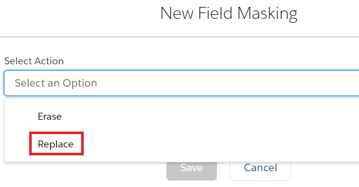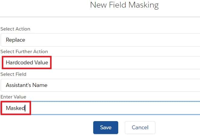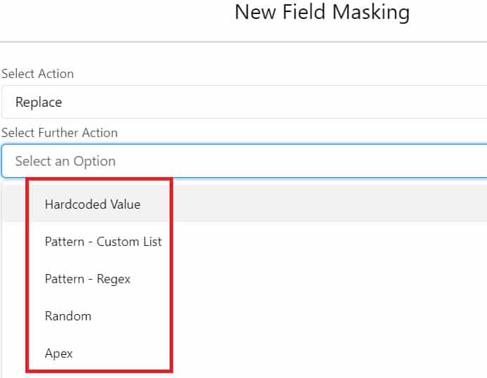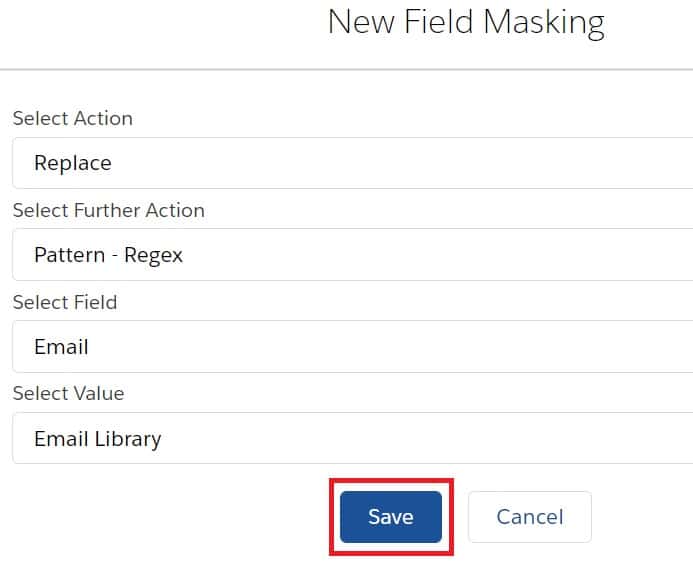 • Pattern – Regex:- While Selecting ‘Pattern – Regex’ from Action, choose the value by which you want to replace the selected field by using patterns from your sandbox (e.g. email, phone number, etc.).