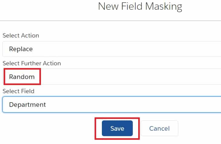 • Random:- While selecting ‘Random’ from Actions, choose the field by which you want to replace the selected field with a Random text/string.