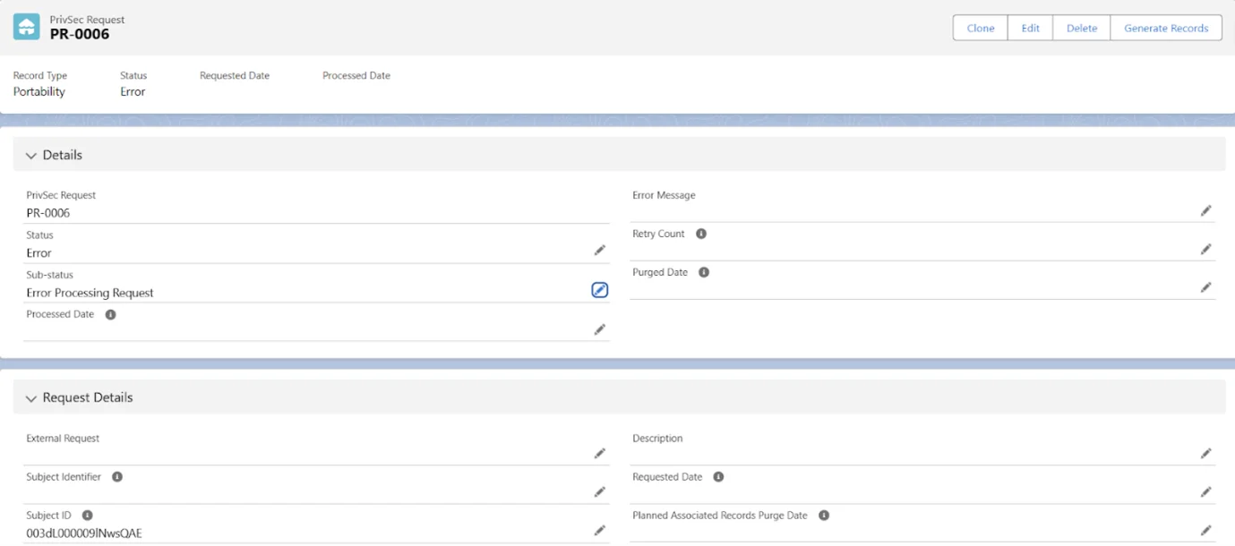 - Users can also run REST API for the errored records with help of Retry REST API. When a privsec request record is errored, the user can run the REST API to retry the records that were errored and get it processed.