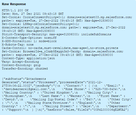 - sendJSON – If true, Cloud Compliance will return all the field details of the processed record under Data Portability in the form of JSON.