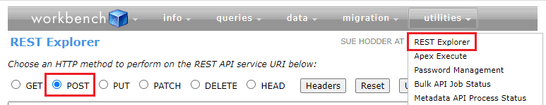 Navigate to the ‘REST Explorer’ utility within the workbench and select the “POST” method.
