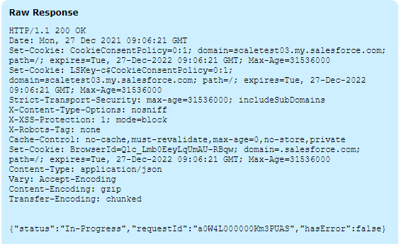 - The REST API returns a RequestId and a success message(hasError: false) and the PrivSec Request gets created in the Org.