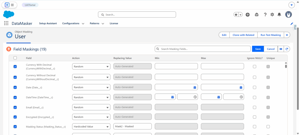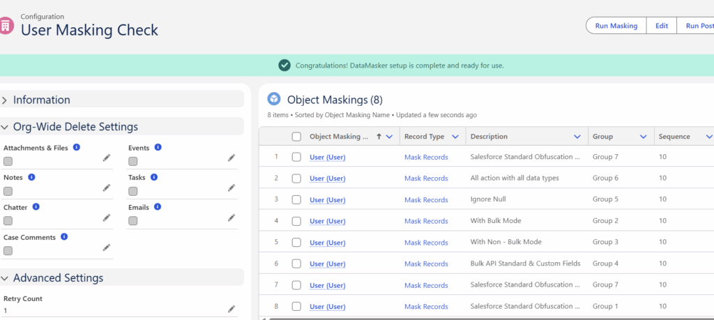 Note: Data Masker uses a Salesforce-provided API that will mask the entire user record, deactivate it, and send no email or notification to the user.
