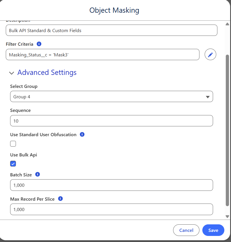 • Custom Masking: Available when “Use Bulk API” is unchecked