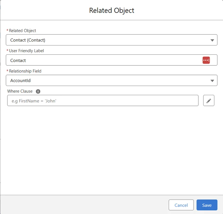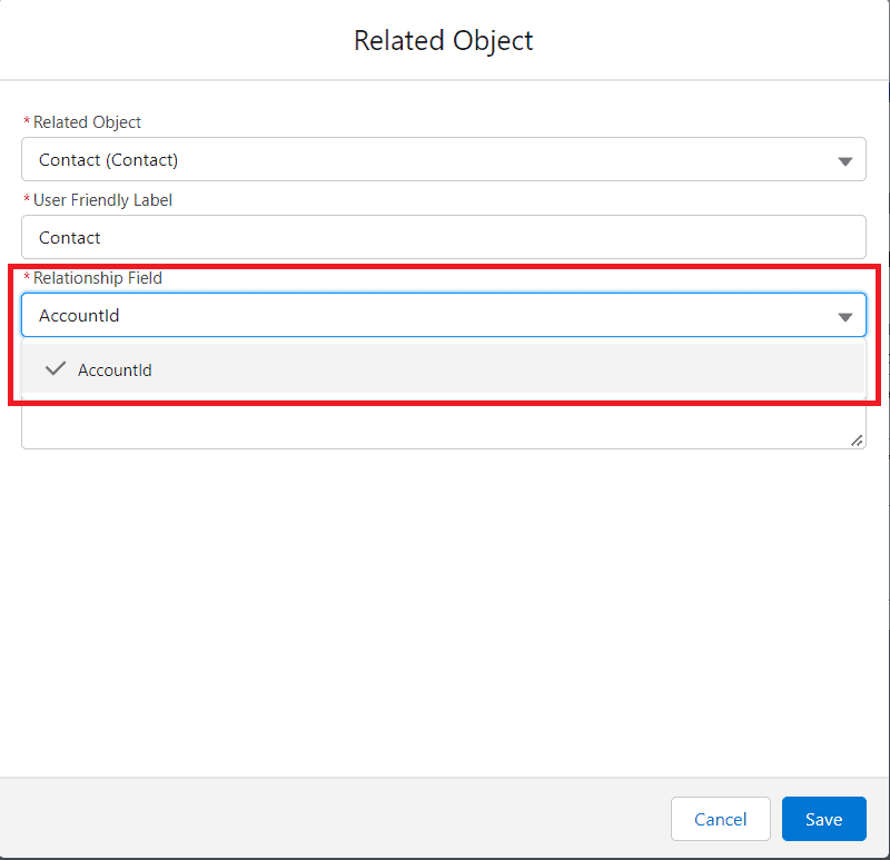 - After selecting the child object the relationship field between the parent and child object will be populated automatically.