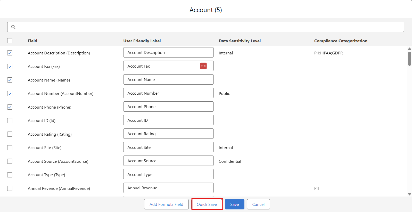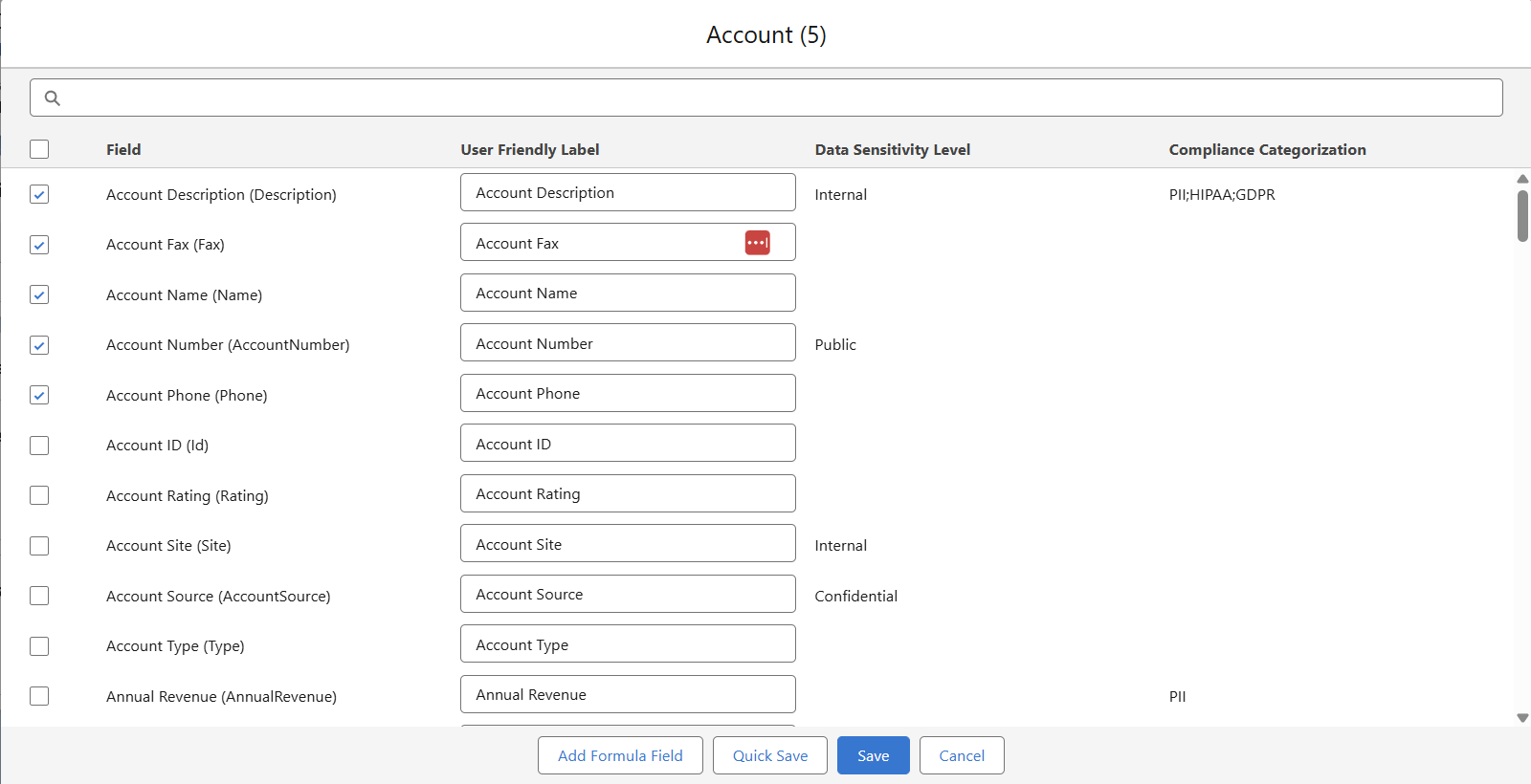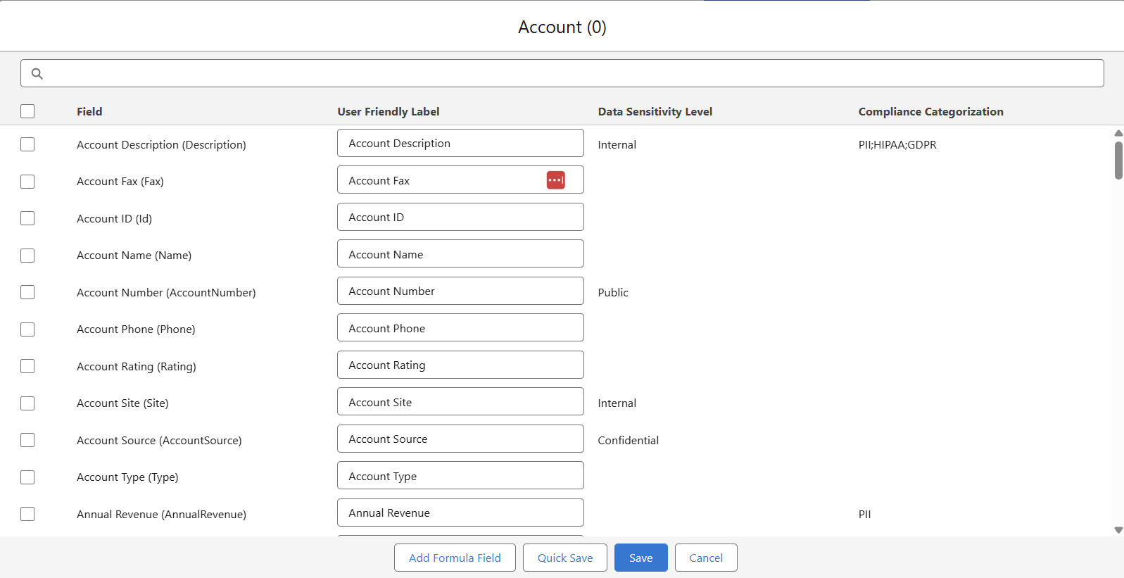 - Search: The search box at the top operates in real-time. It scans the field label, api_name, and type for any occurrence of the entered keyword.
