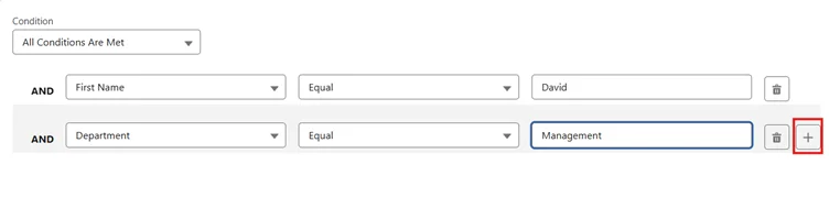 - Users can add more filter clauses by using the plus icon, and conditions can be chosen from the drop-down field.