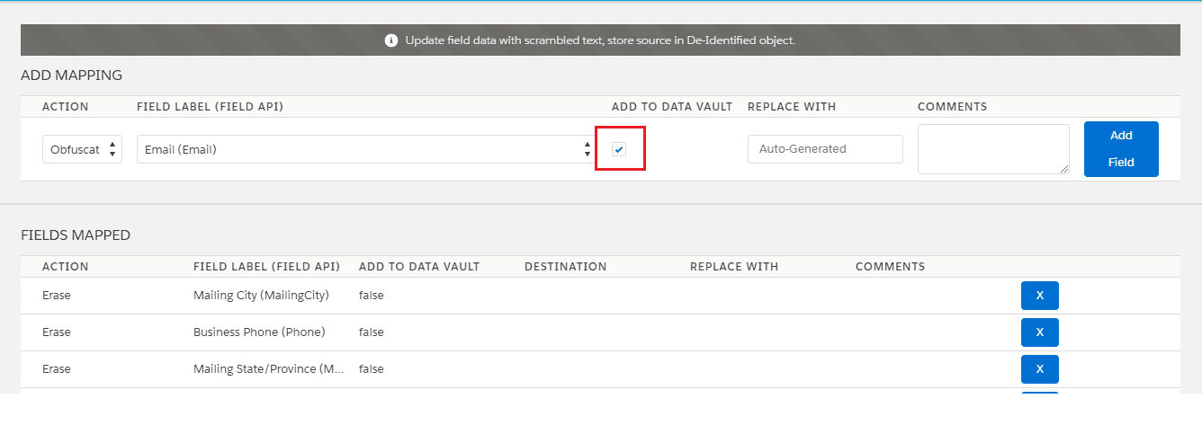 1. To add fields in Data Vault(Proof of De-identification), the user needs to make sure that the ‘Add to Data Vault’ checkbox is checked while adding fields in De-identification mappings for any object.