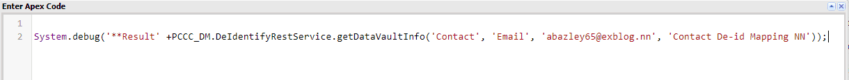 System.debug('**Result' + PCCC_DM.DeIdentifyRestService.getDataVaultInfo('Contact', 'Email', 'abazley65@exblog.nn', 'Contact De-id Mapping NN')); |