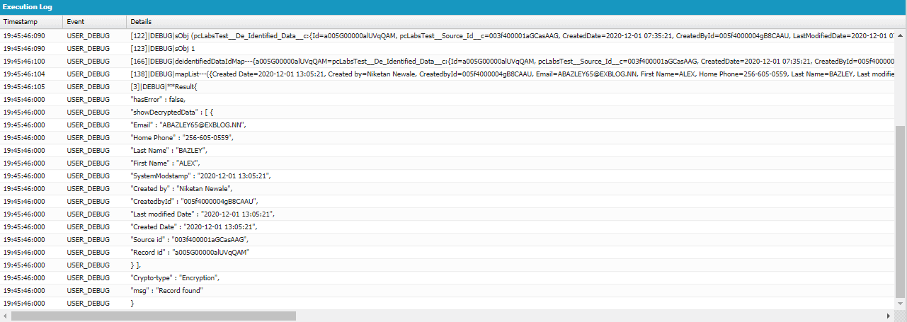 5. This API returns all the fields and their values that are stored in the org as a “Proof of De-identification”. Also, it will return some standard fields like Created Date, Created By, Last Modified Date, Record Id, and Source Id.