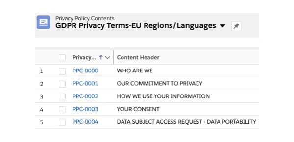 Manage and update policies in Salesforce for multiple regulations, countries, and languages.